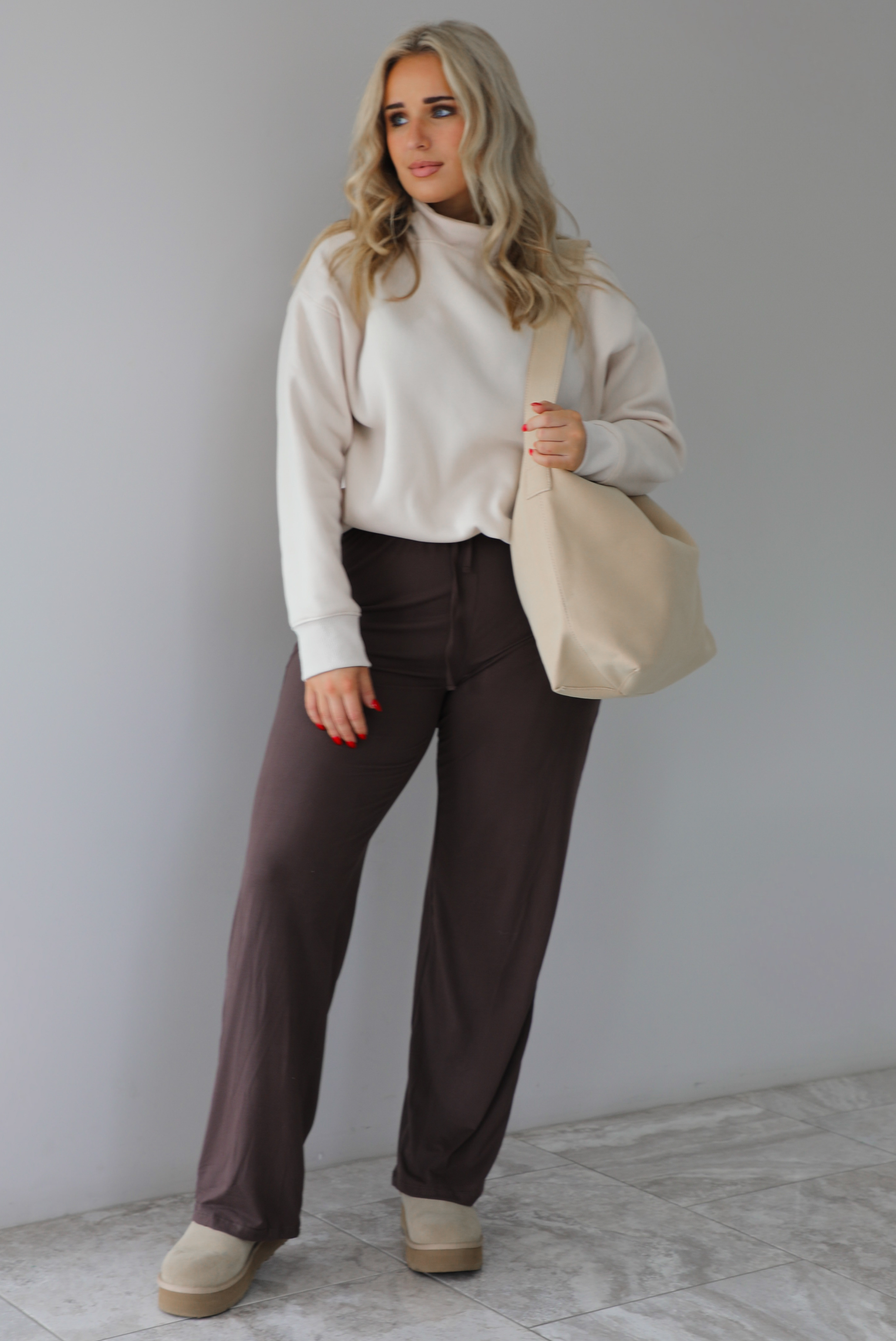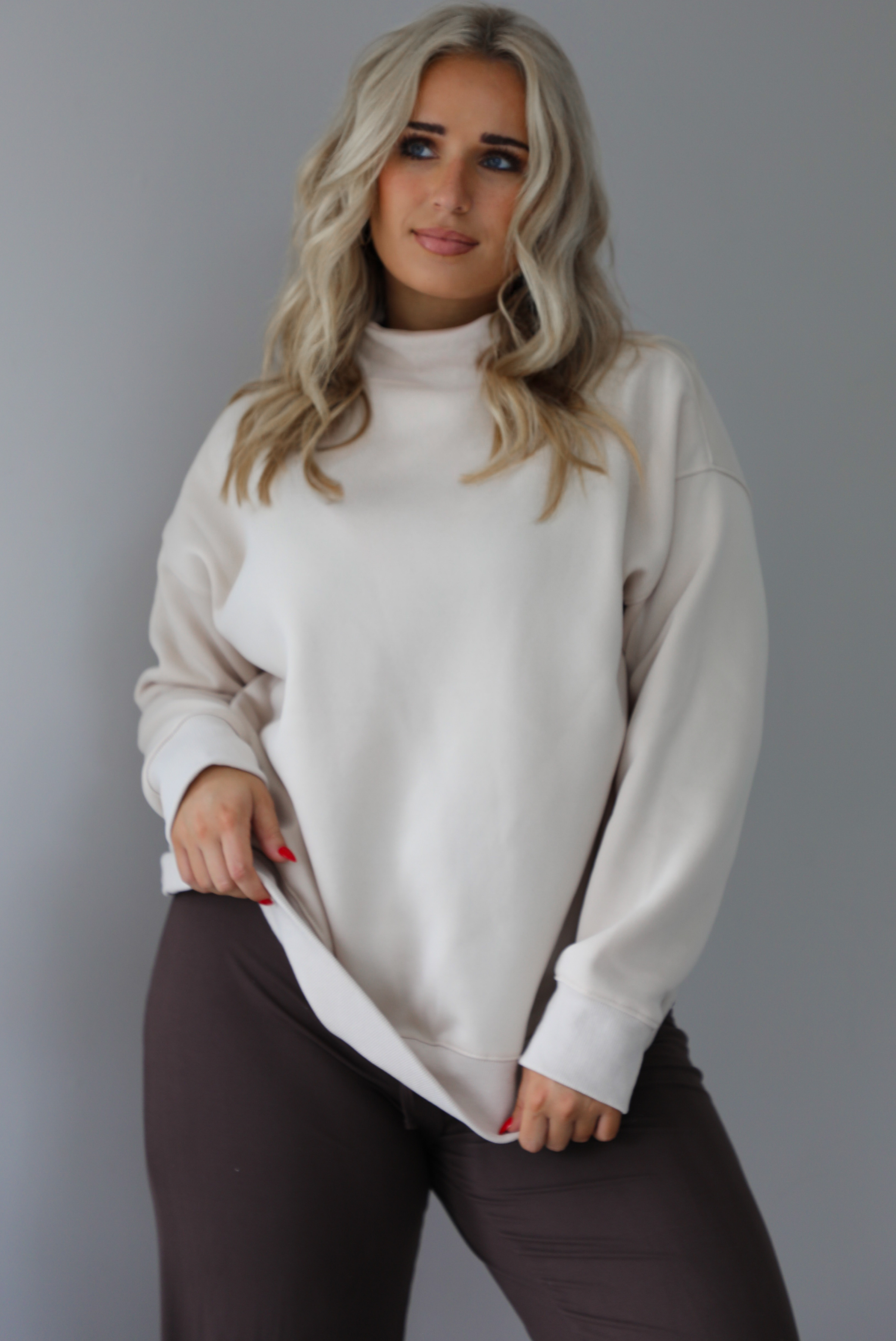 - High-neck sweater that has a split detail at the neckline that makes it easy to slide on and off