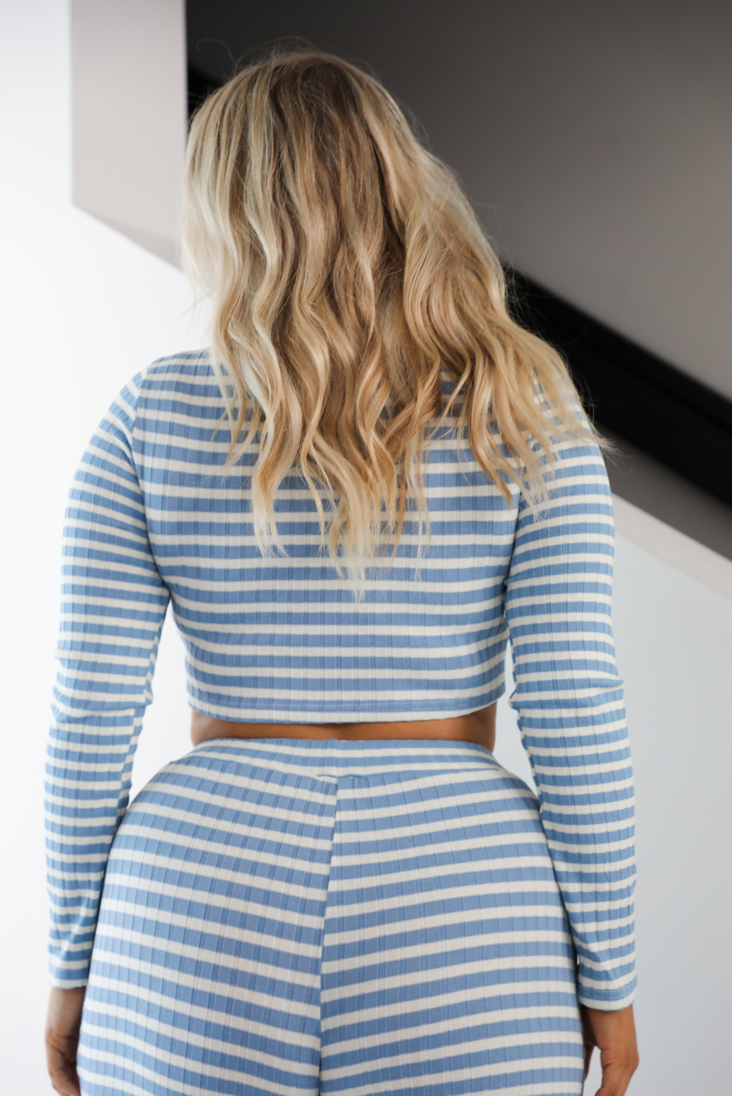 - Two piece set featuring a cropped long sleeved top and high waisted pants
