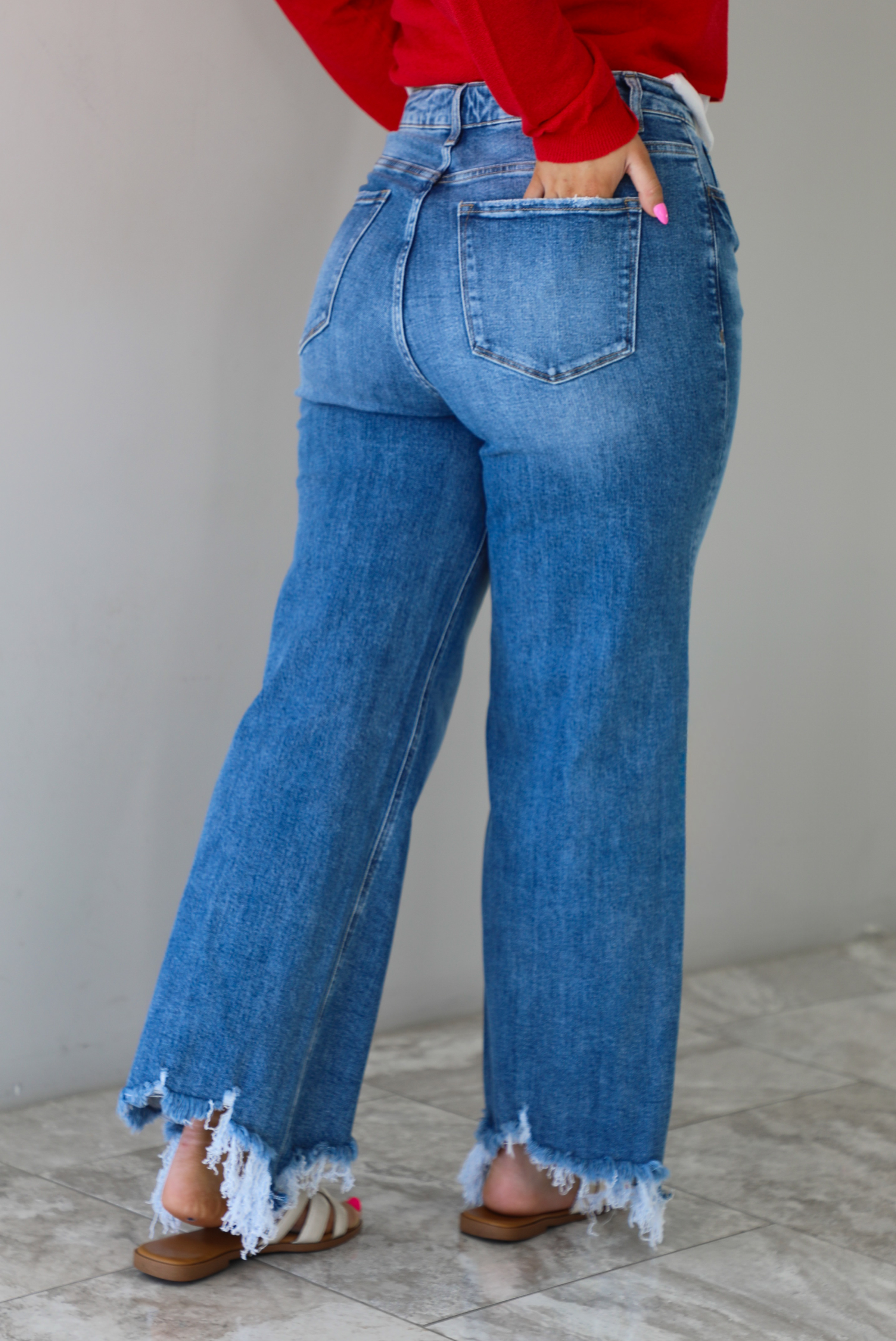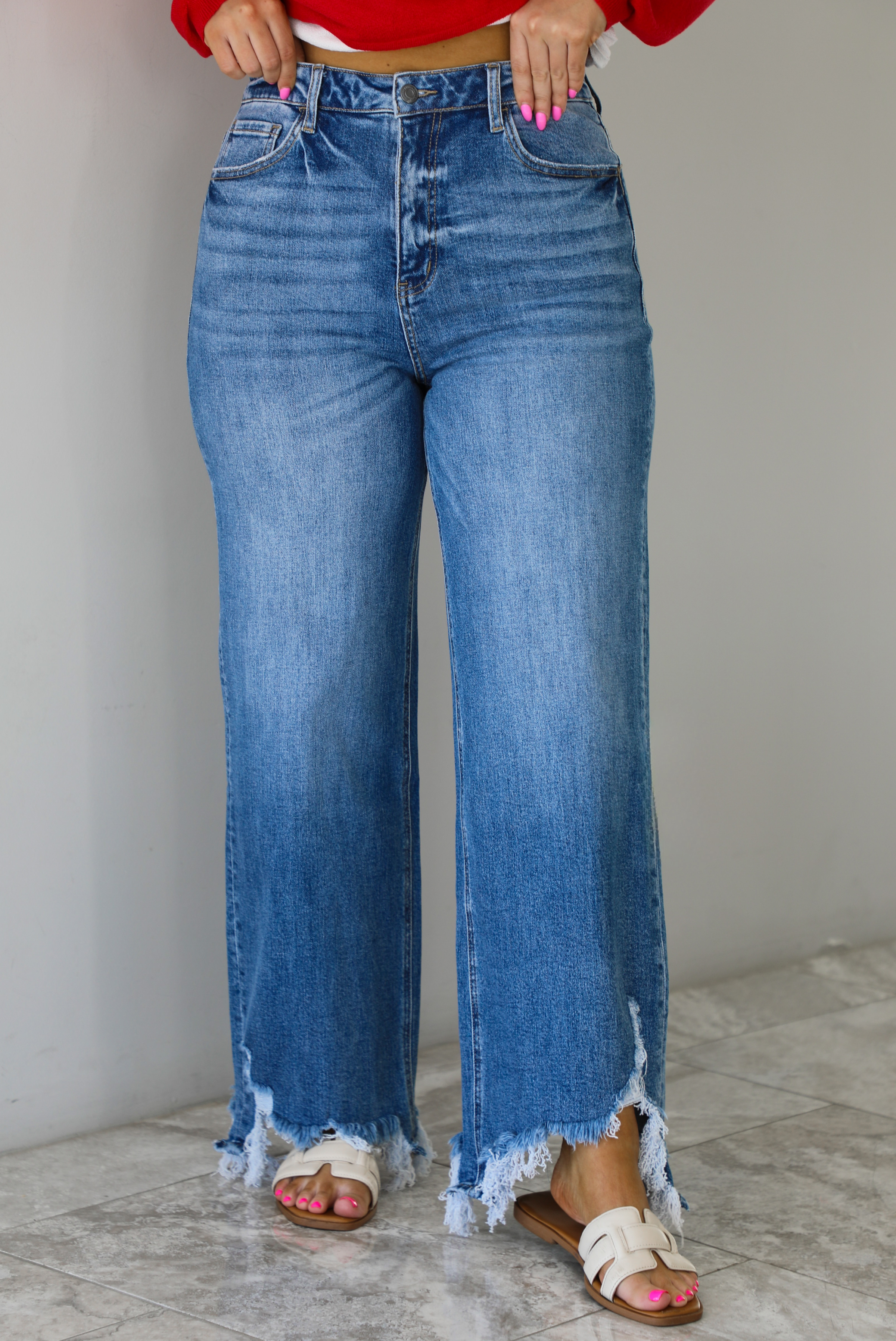 - Distressed hem design