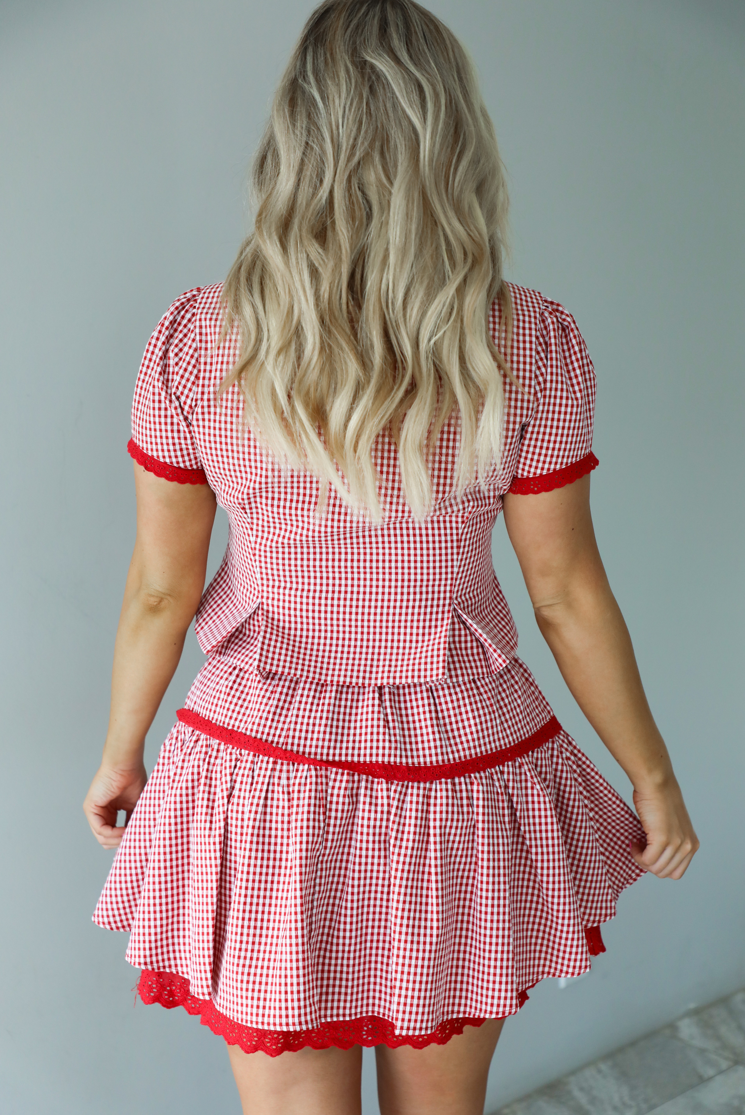 - Two piece set featuring a puffed sleeve, button-up short sleeve top and a high waisted, flared hem skirt
