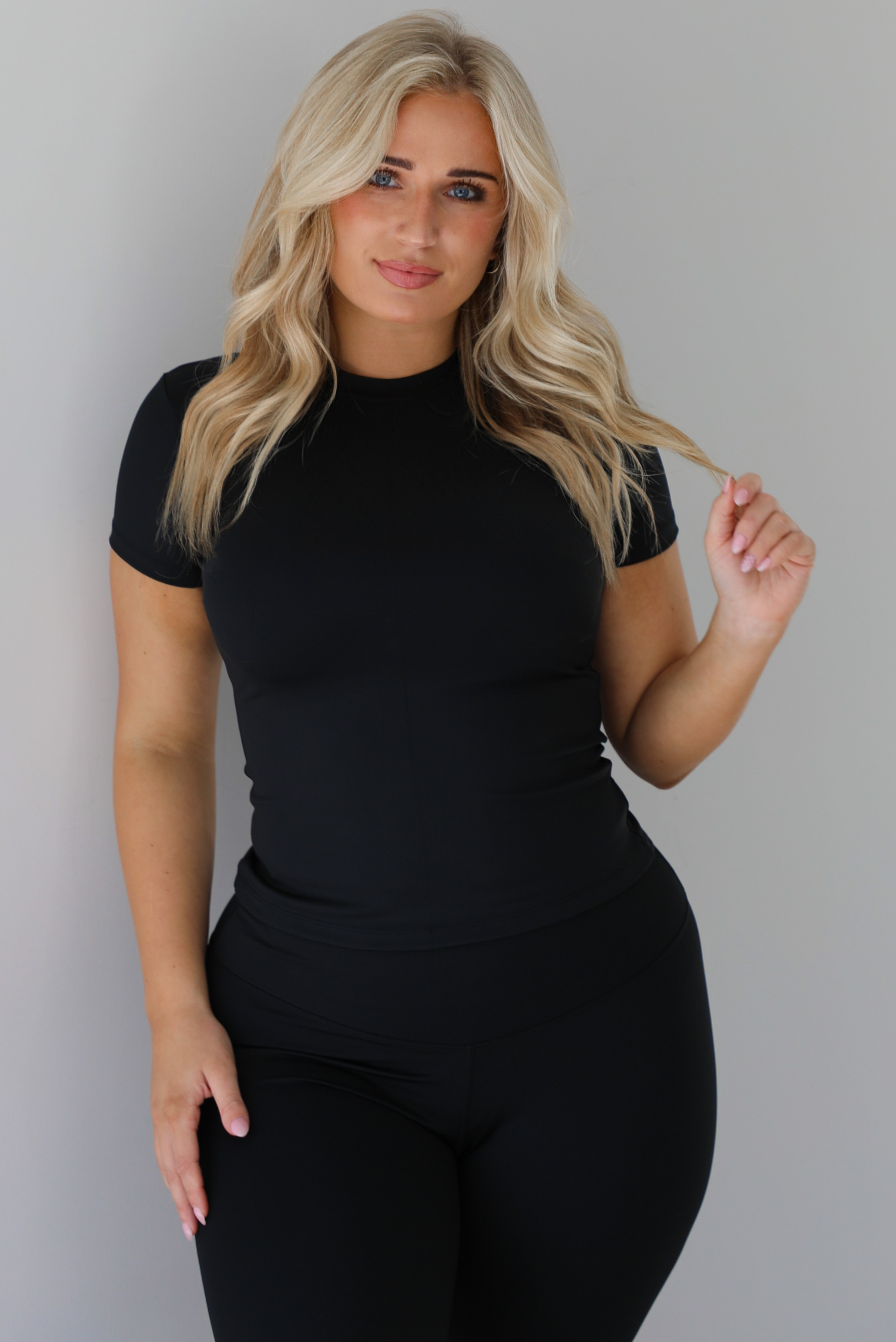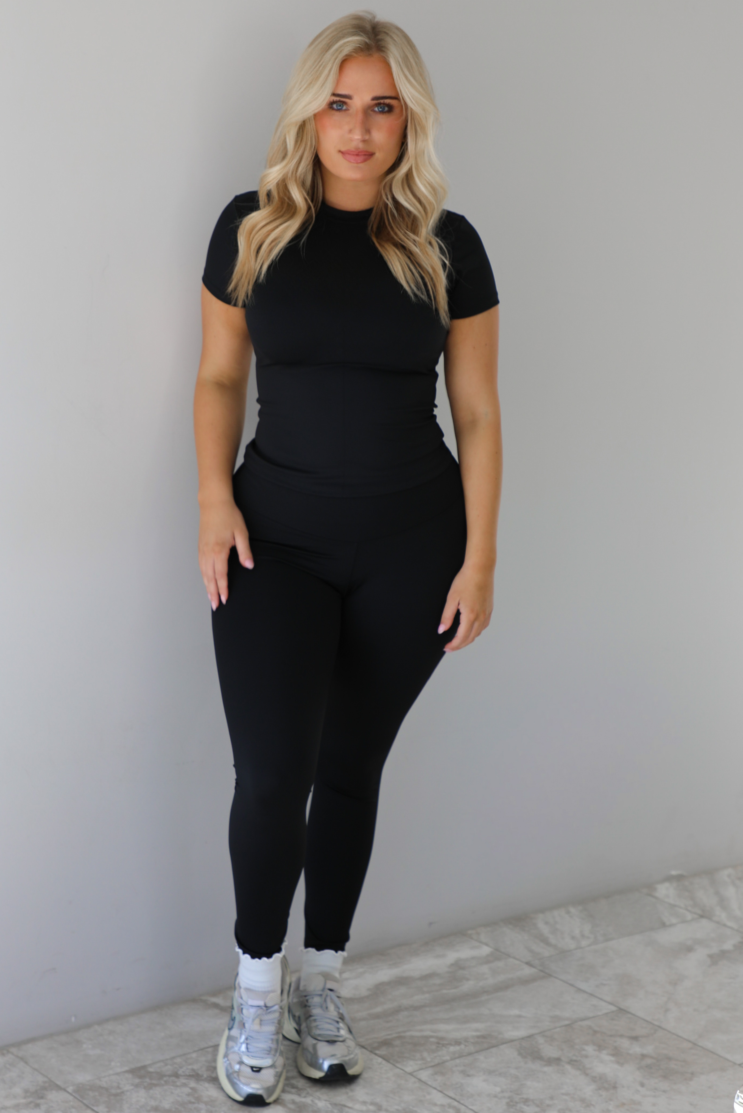 - Two piece set featuring a fitted short sleeved top and fitted leggings