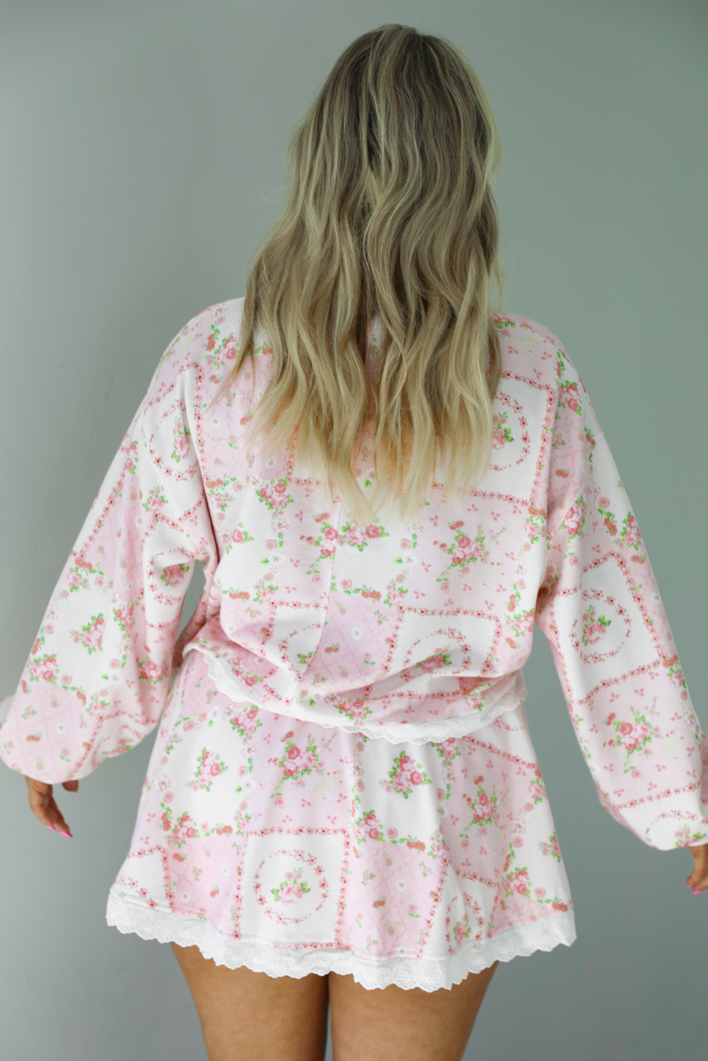 - Pink and multi-colored floral print pattern throughout