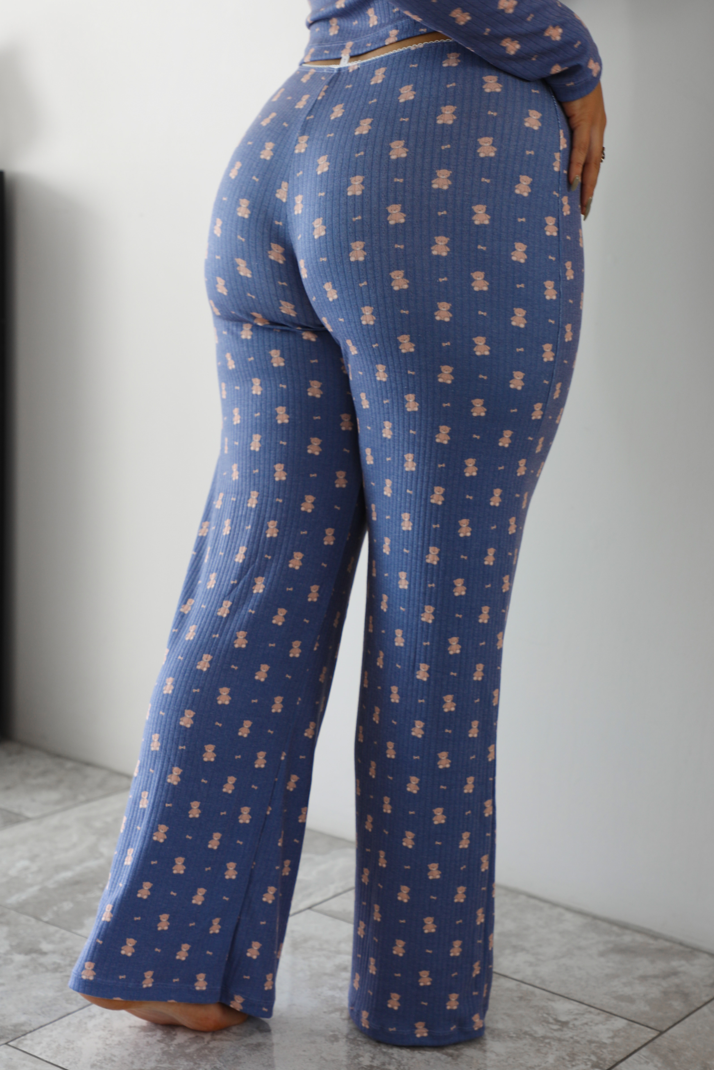 - Blue color throughout with a multi-colored bear print pattern throughout