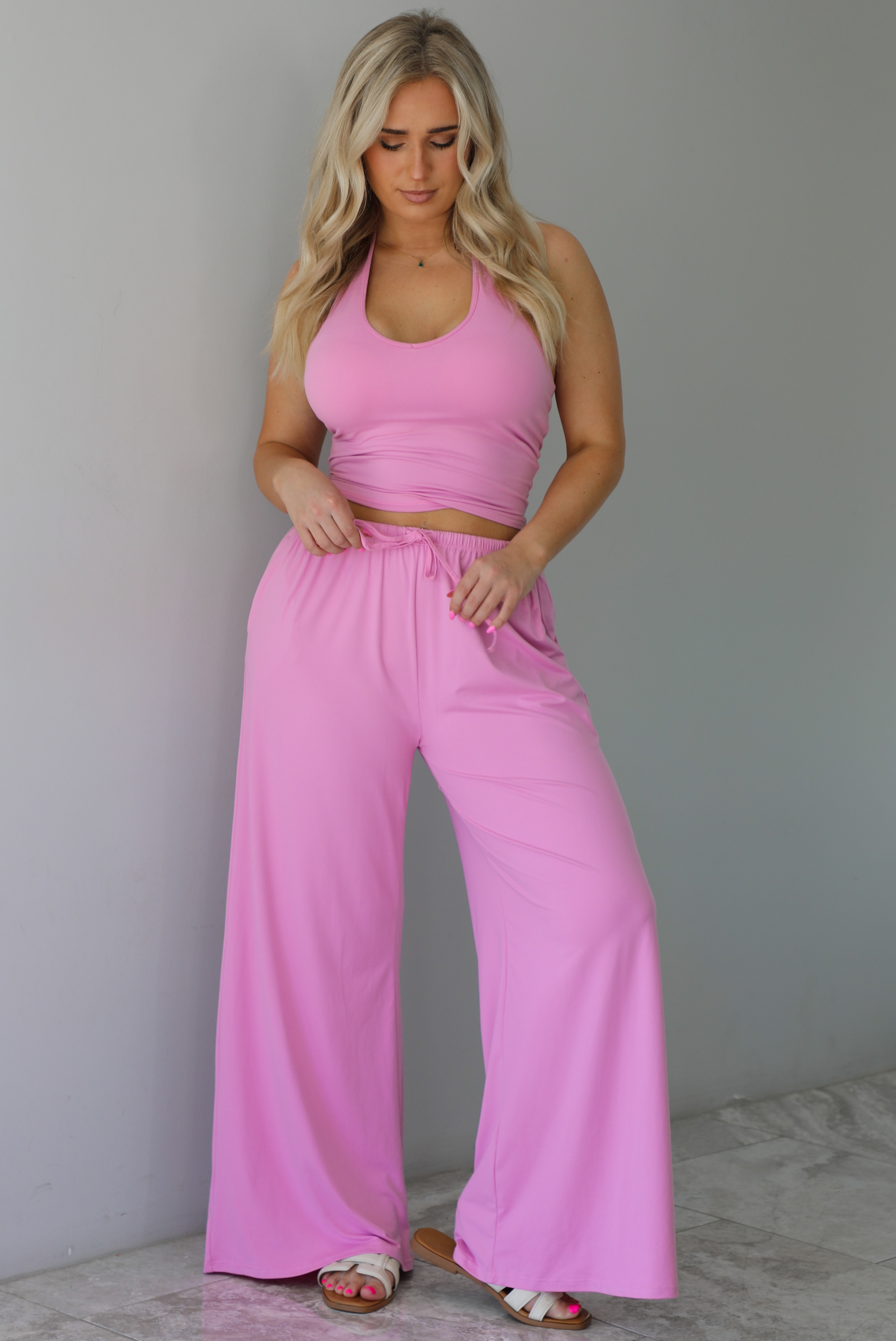 - Two piece set featuring a cropped tank top and high waisted flowy pants