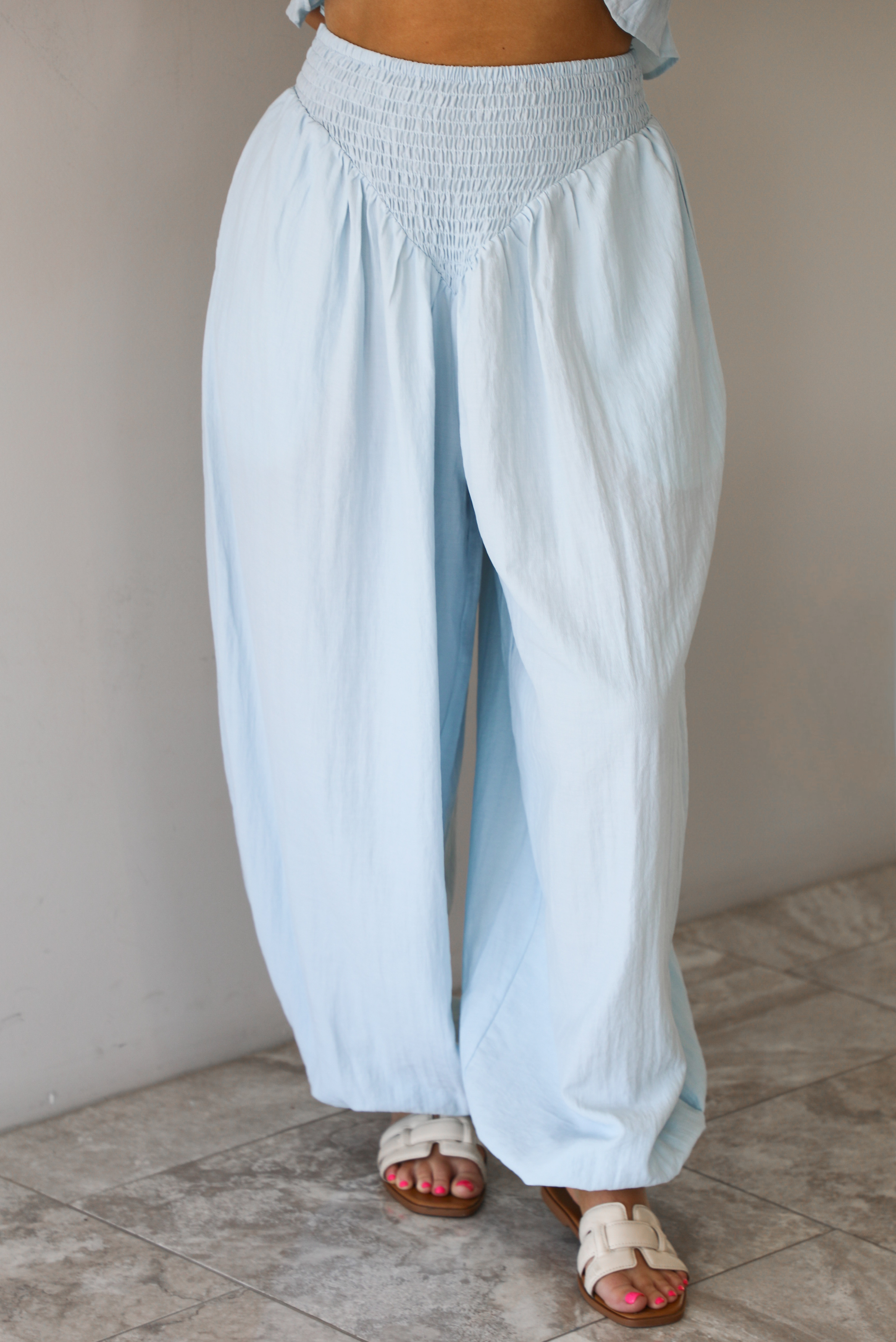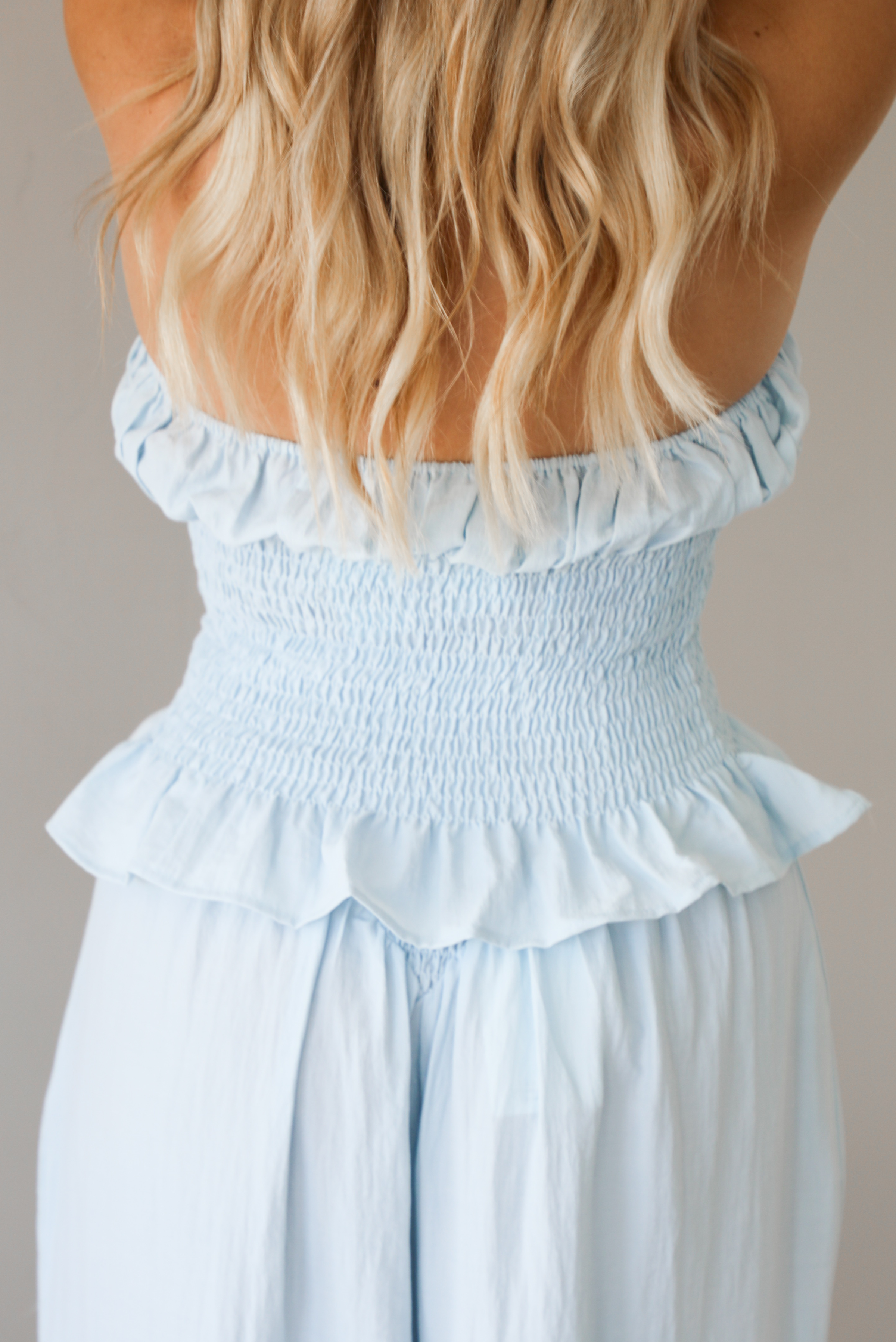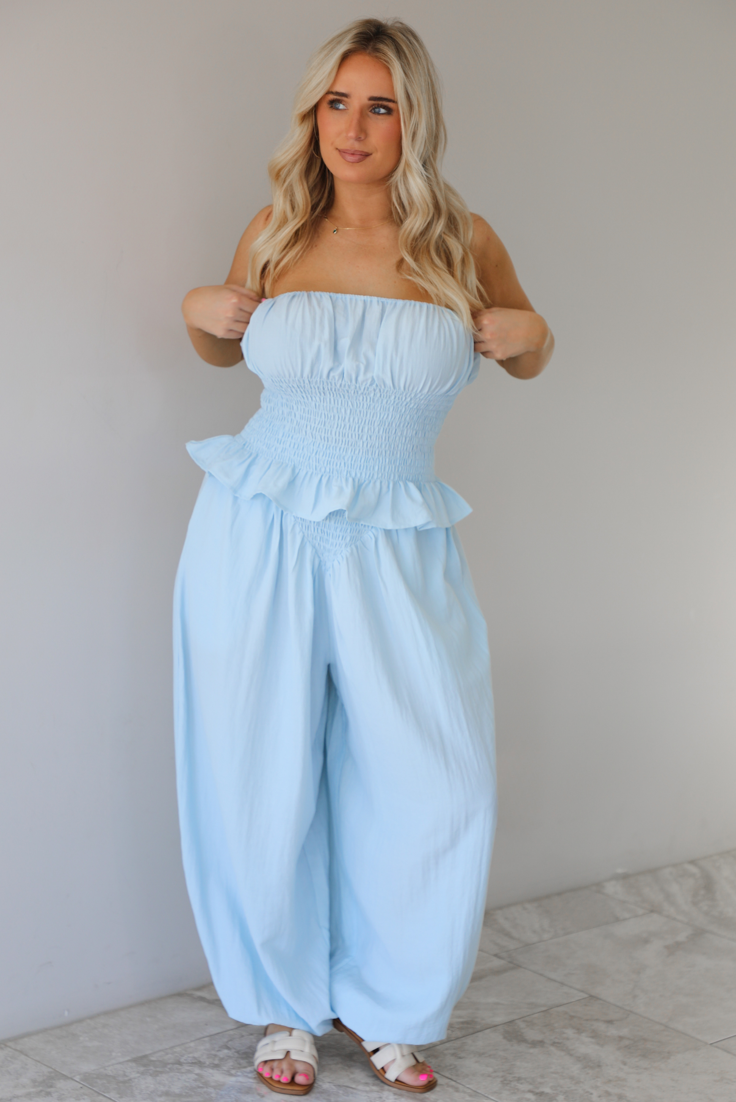 - Two piece set featuring a strapless smocked top with a ruffled hem and high waisted pants with a smocked detail